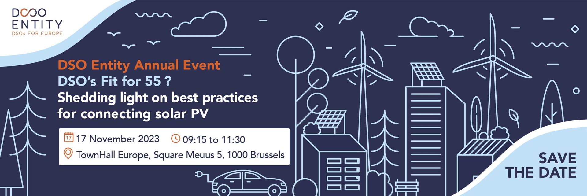 DSO Entity, the legally mandated EU association for European Distribution System Operators (DSOs) representing 900 DSOs, connecting 250 million customers across all 27 EU Member States, is pleased to announce its first Annual Event “DSO’s Fit for 55? – Shedding light on best practices for connecting solar PV” that will take place in Brussels on 17 November 2023, from 9:00 to 11:30 (CET).